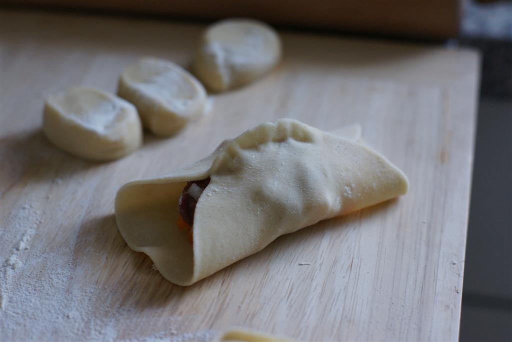 Als erstes faltet man dazu den Teig in der Mitte zu einem Halbmond