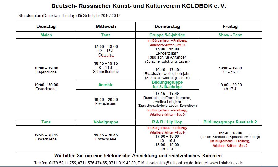 Alle Kursen finden im Jugenhaus M9, Makrelenweg 9A, 70378 Stuttgart-Mönchfeld statt, außer die, bei derer rote Adresse steht. Als .pdf-Datei herunterladen Telefon: 0178-50 11 755, 0711-576 474 65, 0711-319 43 39, E-Mail: valentina@kolobok-ev.de, Internet: www.kolobok-ev.de